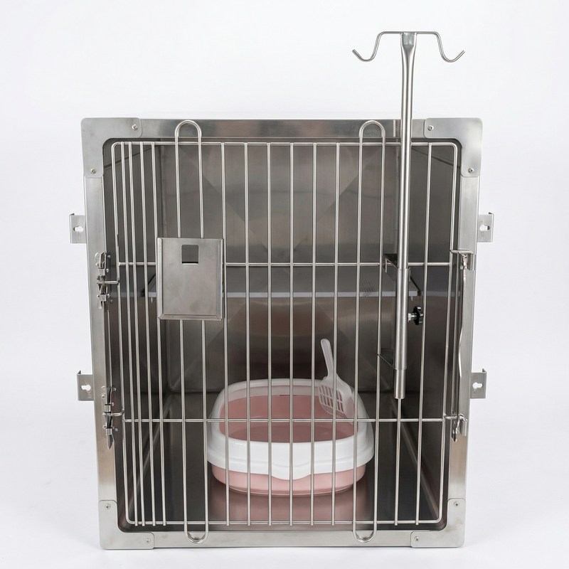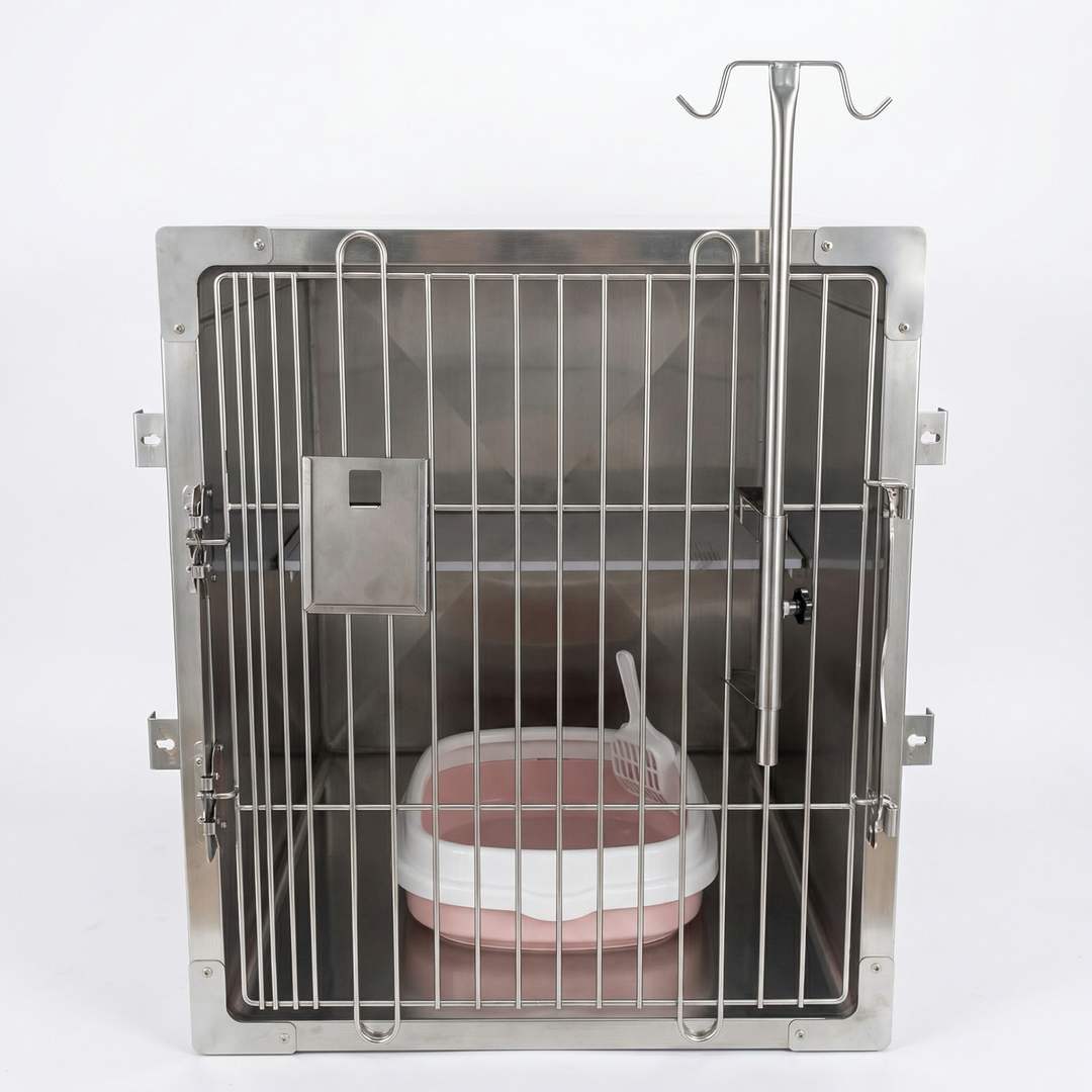 Full 304 Stainless Steel Construction-- All cage walls, door frame, shelf, and hardware are fabricated from 304-grade stainless steel for maximum corrosion resistance, hygienic surfaces, and long service life in wet clinical environments.