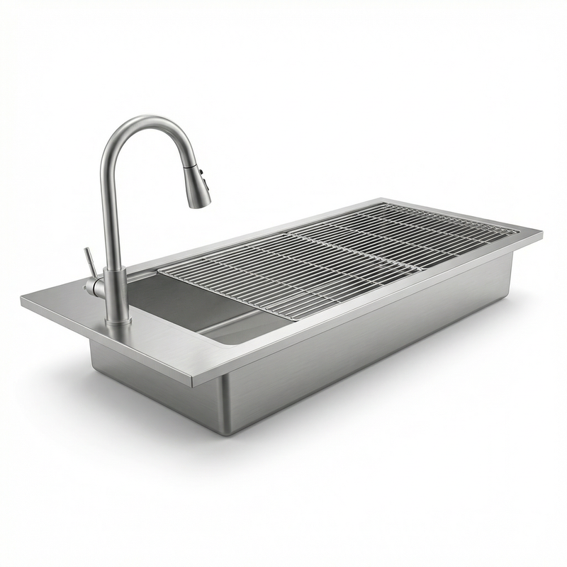 Full 304 Stainless Steel Construction -- The entire unit -- sink basin, grid mesh top, side flanges, and body -- is fabricated from premium 304 stainless steel, offering outstanding resistance to corrosion, disinfectants, and biological fluids in demanding veterinary environments.
